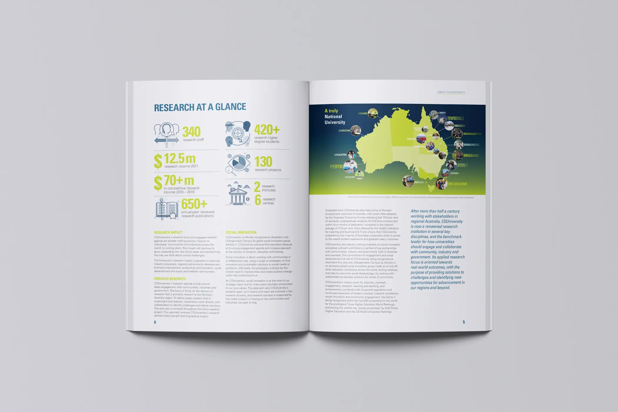 CQUniversity needed a compelling publication to elevate their research profile and demonstrate legitimacy within the higher education sector. The challenge was presenting complex, varied research projects in an accessible format that would resonate with government bodies, research organisations, and the broader academic community whilst positioning CQU as a serious research institution.