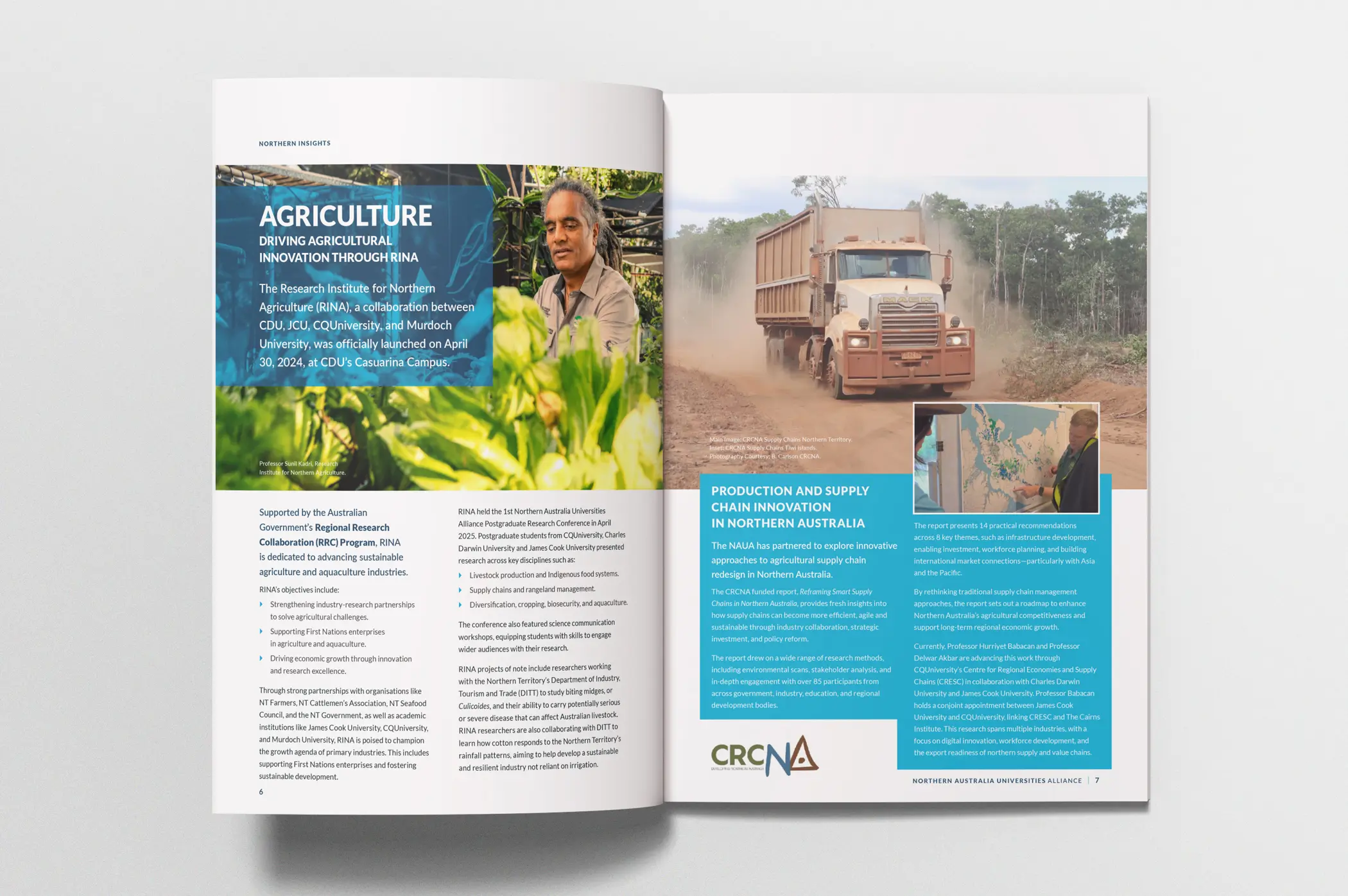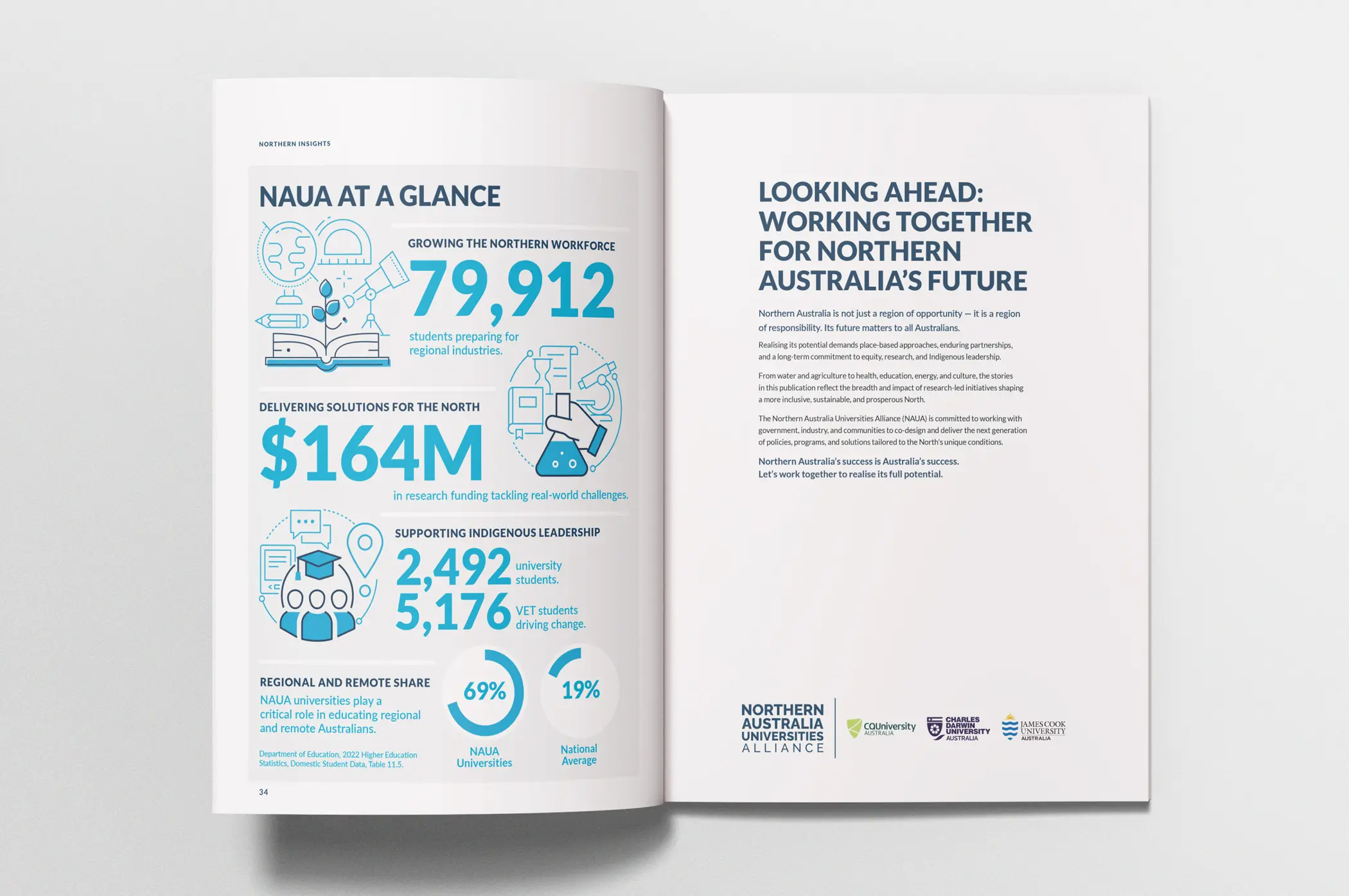 Northern Insights is a 36-page flagship publication for the Northern Australia Universities Alliance (NAUA), designed as a strategic communication tool to showcase the transformative research and collaborative initiatives across Australia’s North.